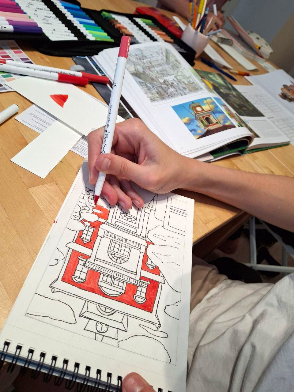 I encourage children to explore not only characters but also the backgrounds and buildings in their manga, anime, or other illustrations. Creating buildings can be a lot of fun! Many children feel more comfortable using markers, which helps them bring out their best work and become more confident with this medium. Below is a piece of art created by one of our students—the credit for this artwork goes entirely to the child!